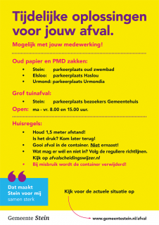 De gemeente Stein en RWM hebben een tijdelijke oplossing gecreëerd voor ons PMD-afval, oud papier en grof tuinafval.
